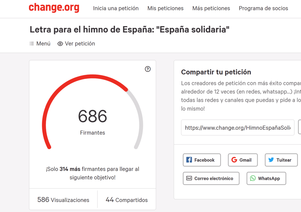 La noche del 25 al 26 de julio de 2020 lanzamos esta ‘quijosanchesca’ campaña para que el himno nacional de España tenga una letra con un espíritu de presente y de futuro. Con unas circunstancias sociales complicadas, y siendo un atípico mes de agosto, no podemos dar más que las gracias a todos los que os habéis interesado y apoyado esta campaña a través de las distintas vías que hemos abierto. Seguiremos desarrollando el blog hispaniasolidaria.com y desarrollando el plan de posts que tenemos previsto, además de otros que surjan al hilo de la actualidad como en las últimas semanas.